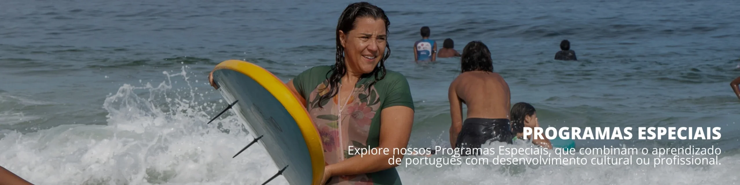 Participe das nossas aulas em grupo de português brasileiro, oferecidas 5 dias por semana, de segunda a sexta, das 9h às 13h (4 horas diárias). Atendemos todos os níveis, de A1.1 (Iniciante) a C (Avançado). Além disso, você receberá 3 aulas particulares de Surf por semana para aprofundar sua imersão cultural.