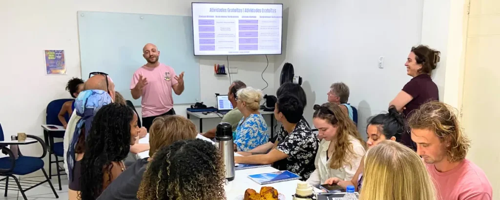 Every week, we host an orientation session for our new students! It’s a wonderful opportunity to learn about our school, Ipanema, our social program, Mais Caminhos, and receive helpful tips for living in Rio as a foreigner. Additionally, we treat you to delicious cakes from the bakery next door, scrumptious coffee, and great company! This session is the perfect chance to meet fellow new students and get to know some of our amazing staff.